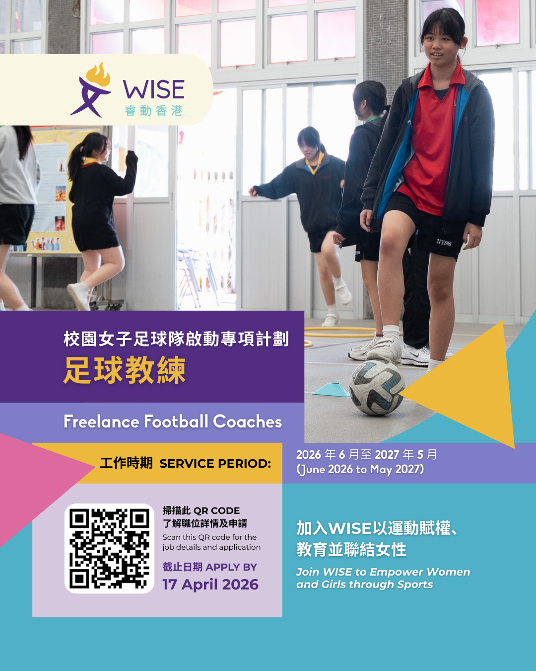 我們現正招聘足球教練,於 2026 年 6 月至 2027 年 5 月期間與 WISE 一同進行專項計劃,與本地中學女學生互動,教導她們足球技能。
